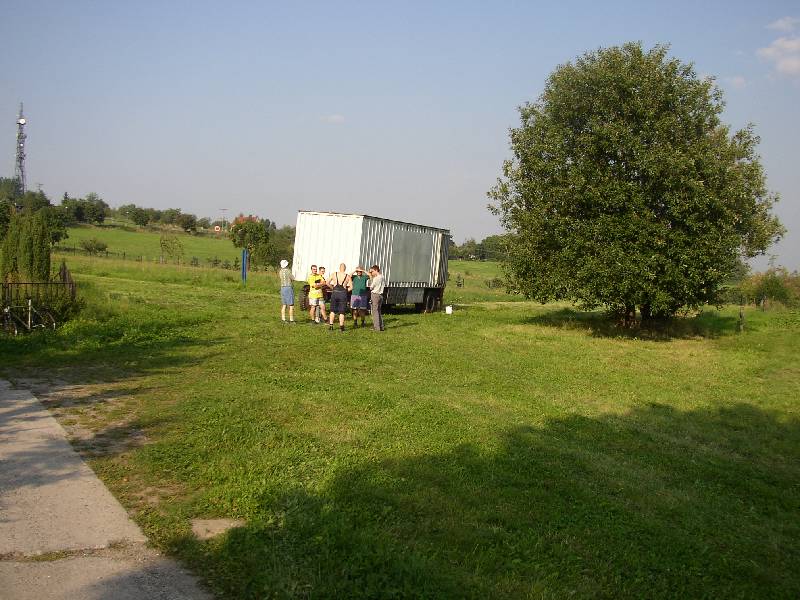 Das Festzelt, noch auf dem Anhänger, die Wiese noch oberflächlich gemäht.