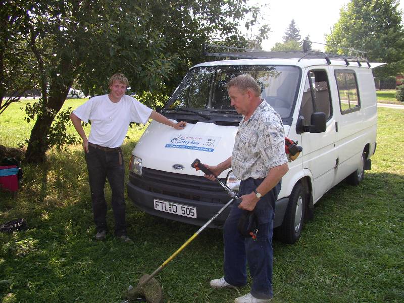 Christian S. und Sohn beim finalen Rasentrimmen.