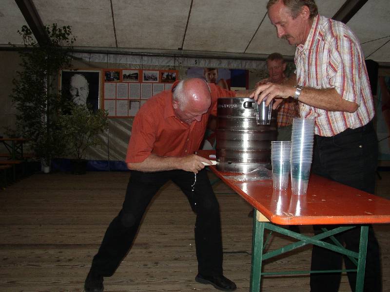 Und los geht's mit dem Bieranstich. Scheint gar nicht so einfach zu sein.
